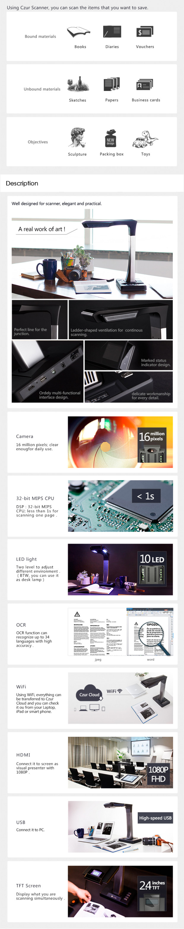 Czur integra una luce a LED regolabile (per l’uso anche in ambienti poco luminosi o per usare il dispositivo come lampada) funziona anche senza driver e computer (è presente un display sulla parte superiore) permettendo di memorizzare i documenti digitalizzati sul cloud e accedere a questo da vari dispositivi (inclusi iPhone e iPad). Funzionalità di OCR consentono di riconoscere 34 lingue di serie. L’arrivo sul mercato è previsto per gennaio del 2016. Contribuendo ora al progetto, sarà possibile averlo per 189$; il prezzo di listino previsto è di 399$.
