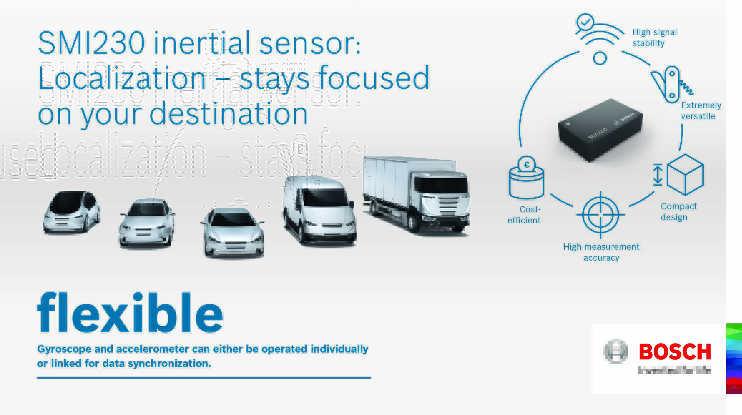 Grazie alla combinazione di posizione GPS e informazioni del sensore, la freccia di navigazione sul display non compie più salti irrealistici e non cambia più orientamento all’improvviso lungo il percorso da un punto a un altro. «I circuiti elettronici a semiconduttore sono la chiave per la mobilità dei nostri giorni, oggi è impossibile immaginare auto che ne siano prive» ha affermato Fabrowsky. Bosch ha avviato la produzione del sensore SMI230 di recente e i primi clienti stanno già ricevendo il sensore come dotazione di serie.