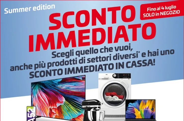 Grazie alla promozione Sconto Immediato è possibile acquistare i prodotti desiderati nei negozi della catena Comet, anche più prodotti di categorie diverse: raggiungendo un totale di spesa di 300 euro (e fino a 599,99€) si ottiene uno sconto di 50 euro direttamente alla cassa. Gli sconti aumentano con l’aumentare dell’importo della spesa.