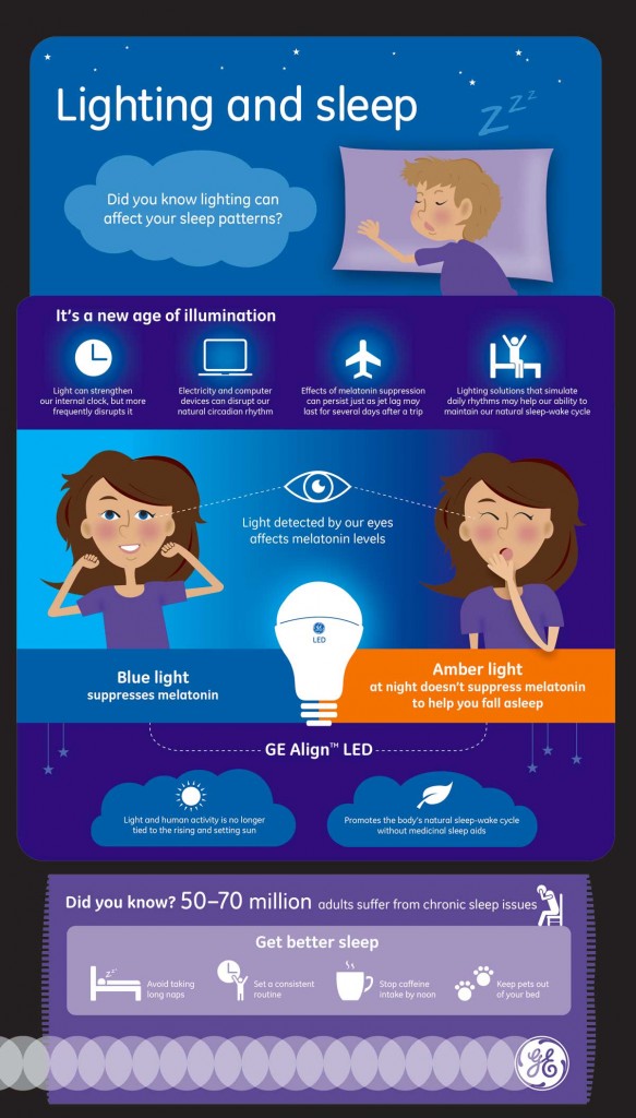 General Electric (GE) ha annunciato che sfrutterà la piattaforma HomeKit di Apple per creare lampade LED “intelligenti” controllabili da dispositivi iOS e con integrate funzionalità che permetteranno di cambiare colore e sfruttare “Align“, tecnologia che dovrebbe consentire di migliorare il sonno limitando l’emissione luminosa del blu nei momenti critici. Secondo la bioarchitettura anti-insonnia, per addormentarsi prima e riposare meglio bisognerebbe alzarsi presto la mattina ed esporsi il più possibile alla luce solare, quella blu del primo mattino. È quanto sostenuto in uno studio pubblicato su Neuroendocrinology Letters, secondo il quale l`esposizione alla luce regola l`insorgere della melatonina, l`ormone che indica all`organismo quando è ora di andare a dormire. Secondo ricercatori del Rensselaer Polytechnic Institute’s Lighting Research Center, se non ci si sottopone alla luce blu del mattino, si ritarda l`insorgenza di melatonina, l`ormone che segnala al corpo quando è notte.