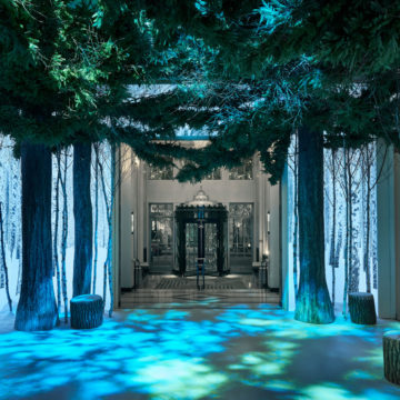 Ad essere particolarmente scenografica è l’illuminazione, sincronizzato che si illumina a ritmo di musica, per creare un effetto maculato nello spazio, che attraversa le ore del giorno, passando dall’alba ad scena notturna. Ive e Newson spiegano come la loro installazione festiva per Claridges esplora il rapporto tra natura e tecnologia: