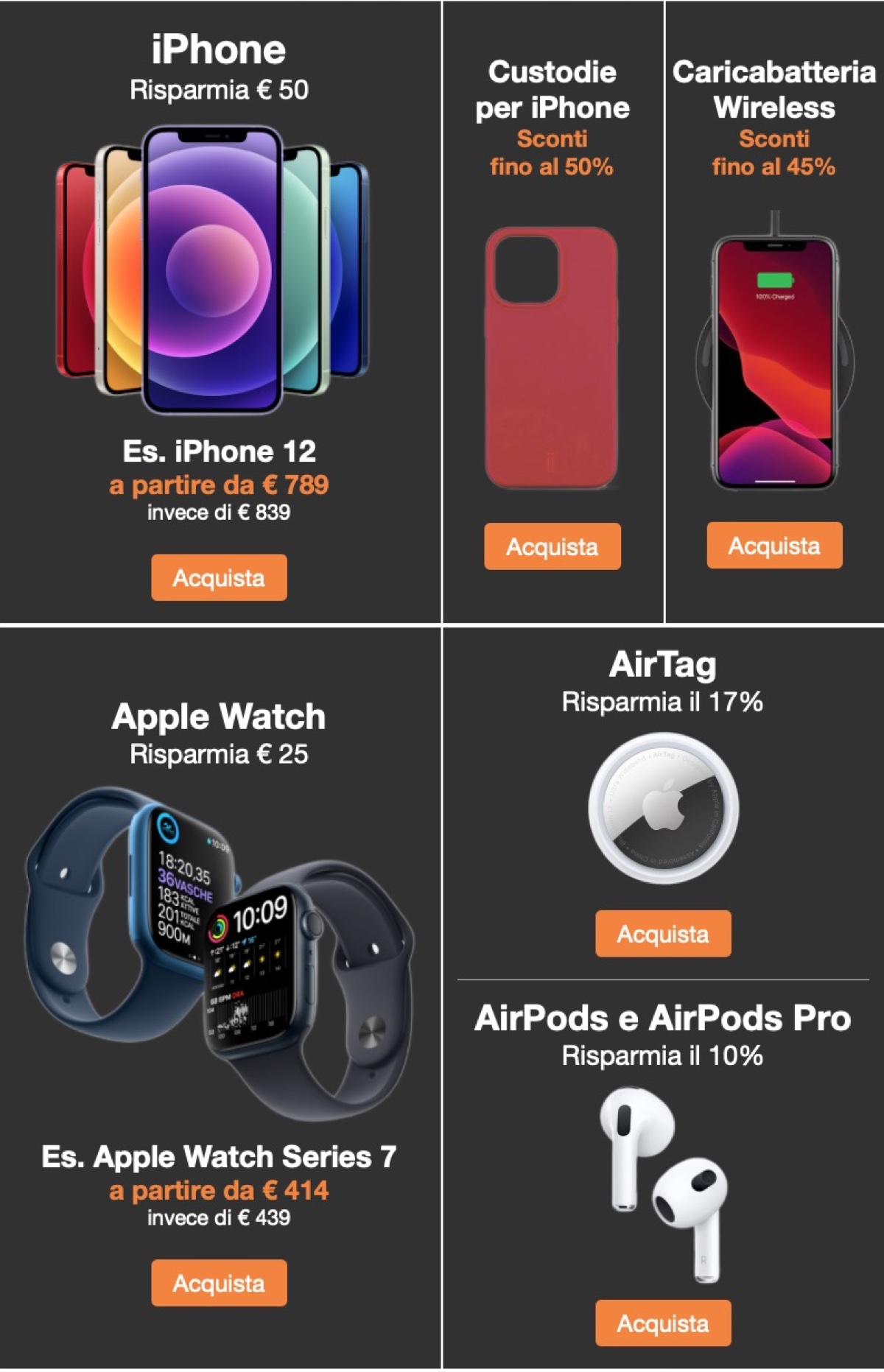 Le promozioni Juice includono uno sconto di 50 euro sul prezzo di listino iPhone, per esempio iPhone 13 e 13 mini partono da 789 euro invece del prezzo di listino di 839 euro, iPhone 11 si compra solo a 569 euro invece di 619 euro, sempre con la possibilità di pagare a rate senza costi né interessi.