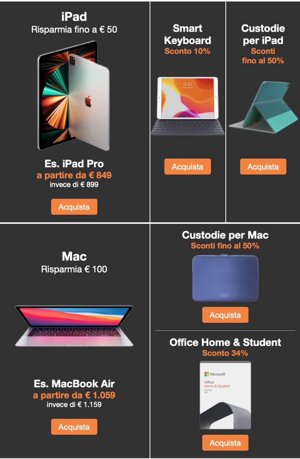 Lo sconto è di 25 euro su Apple Watch, il 17% di sconto su AirTag, il 10% di sconto su AirPods e il risparmio arriva fino a 100 euro sui Mac, inclusi i più recenti e potenti MacBook Pro 2021 con processori Apple M1 Pro e M1 Max: grazie a questa promozione MacBook Air M1 si compra a solo 1.059 euro invece di 1.159 euro, con la possibilità di pagarlo in 36 piccole rate da 28,05 euro con JuiceEvolution.