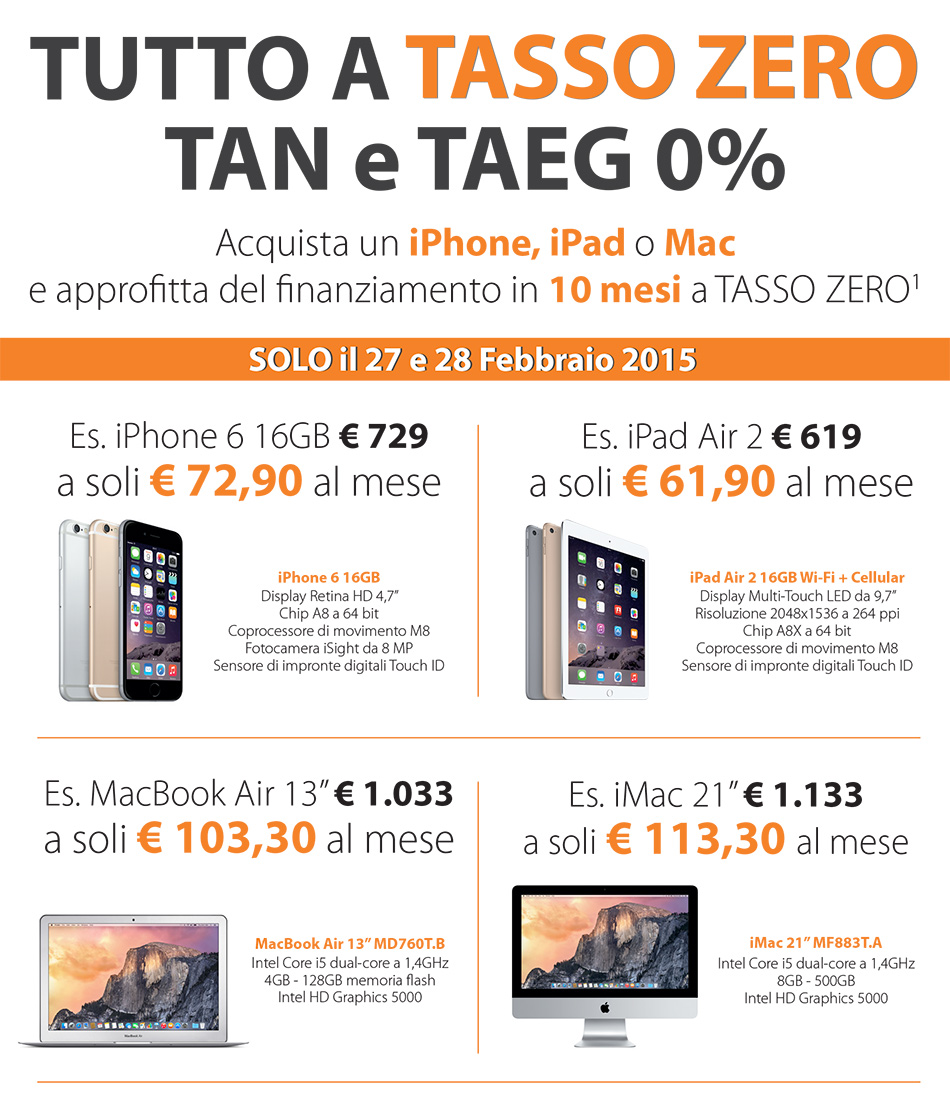 Ecco alcuni esempi: chi acquista iPhone 6 16GB da 729 euro paga 10 rate da 72,90 euro. Per iPad Air 2 da 619 euro l’importo da pagare è di 61,90 euro al mese sempre per 10 mesi. MacBook Air 13” da 1.033 euro si paga con 10 rate da 103,30 euro, mentre iMac 21” da 1.133 euro costa 113,30 euro al mese per 10 mesi.