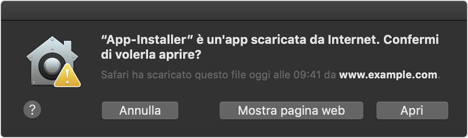 Se le impostazioni del Mac autorizzano le app scaricate dall’App Store e quelle provenienti da sviluppatori noti, la prima volta che avviamo un’app di uno sviluppatore noto, il Mac chiede se vogliamo aprirla. e un’app è stata autenticata da Apple, significa che ha superato un controllo di sicurezza. Le app non autenticate mostrano un’icona gialla di avvertimento.
