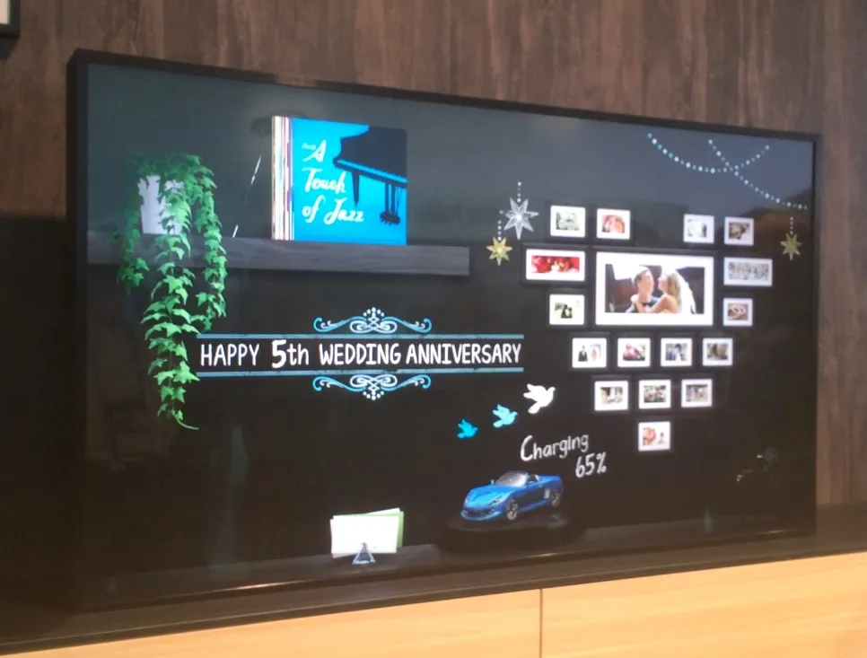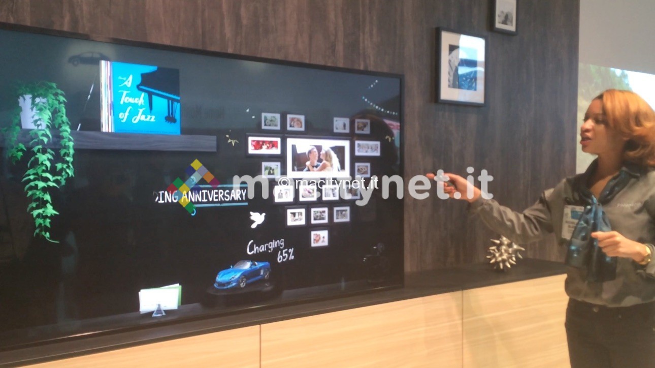 L’effetto è indubbiamente affascinante ma è suggestiva pure l’organizzazione del contenuto che appare sullo schermo poiché si tratta non solo di un sistema fatto per visualizzare contenuti TV e streaming ma anche il centro di comunicazione della casa, in grado di mostrare lo stato di carica delle batterie della vostra auto elettrica (la casa giapponese produce batterie anche per questo settore), l’album delle foto del vostro anniversario, un simpatico uccellino animato che porta la posta, i minuti che mancano alla fine della cottura del tacchino nel forno, la telecamera all’ingresso di casa e tutto ciò che vi tiene in contatto con la vostra casa connessa.
