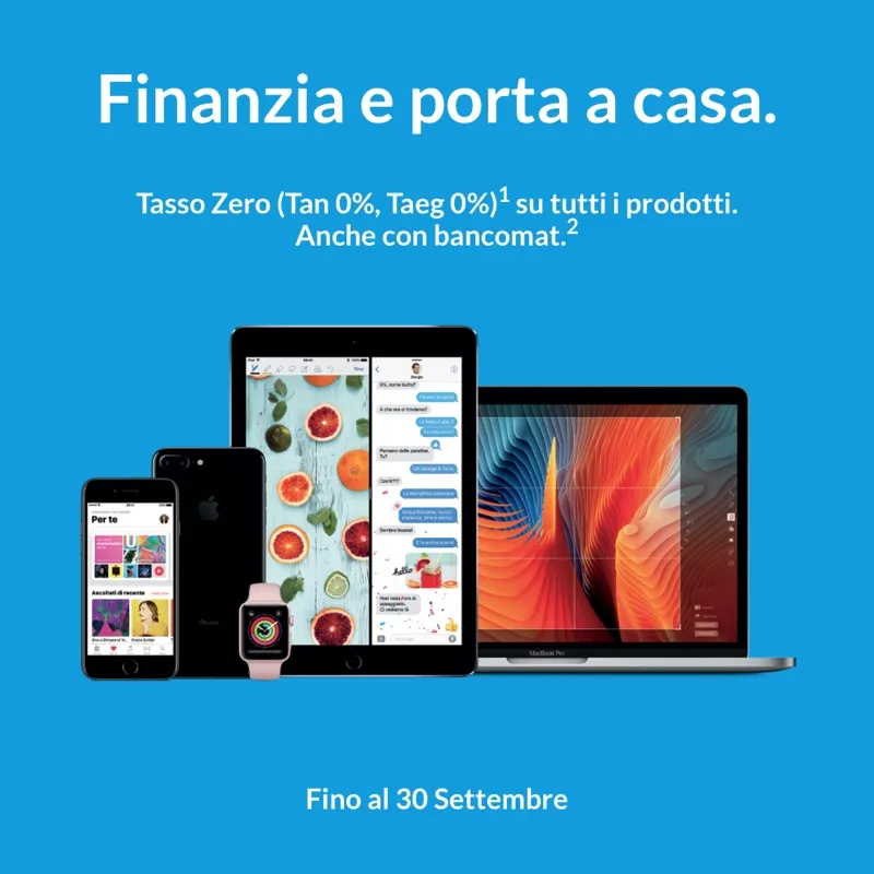 La nuova promozione è valida fino al 30 settembre, non comporta nessun costo aggiuntivo e nessuna spesa per interessi per il cliente, così il costo totale da rimborsare è pari esattamente al prezzo dei prodotto diviso 10. Ecco alcuni esempi: MacBook 12” con SSD da 256GB in 10 rate da 155 euro, MacBook Pro 13” con Touch Bar e SSD da 512GB in 10 rate da 235 euro, iPhone 7 da 128GB in 10 rate da 91 euro, Apple Watch Series 2 da 38mm e Cinturino Sport in 10 rate da 44 euro., iPad 128GB Wi-Fi in 10 rate da 51 euro.