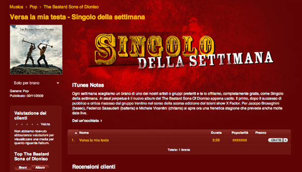 Arriva anche in Italia la promozione Singolo della Settimana, una canzone scelta dallo staff di iTunes Store ed offerta gratuitamente a tutti gli appassionati che dispongono di un account iTunes. Ricordiamo che la promozione Singolo della Settimana è presente già da tempo negli iTunes Store in Stati Uniti, Regno Unito, Francia, Svizzera e anche Paesi Bassi.