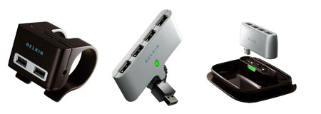 Lo Swivel Hub è un hub snodato che si inserisce in una porta Usb e può essere ruotato di 180 gradi. In questo modo è possobile raggiungere facilmente le porte anche se il computer, come nel caso di un dekstop, è molto vicino ad una parete o ad altri oggetti che rendono difficile inserire i cavi nelle porte. Il Clip On Hub è dotato di una clip che ne consente l’aggancio al bordo di un tavolo, ad una superficie qualunque o ad un fascio di cavi. L’Hub To Go è invece un connettore a sette porte che può essere scomposto, una parte (con tre porte) resta accanto al computer mentre una parte può essere messa in tasca ed usata come hub da viaggio. Il connettore può ruotare per offrire un miglior accesso alle porte; la base ha una piccola nicchia per ospitare graffette, dischi flash e altri oggetti.