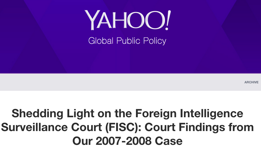 Gli atti di quella lotta fra il Governo e Yahoo restano parzialmente segreti, ma dopo l’esplosione del Datagate nel 2013 l’azienda ha ottenuto il permesso di rendere pubblico un fascicolo di circa 1500 pagine che mostra l’opposizione fra la società di Sunnyvale e il Governo USA. L’azienda guidata ora da Marissa Mayer alla fine ha dovuto issare bandiera bianca, soprattutto di fronte alla minaccia da parte del Governo di multare Yahoo con una sanzione pari a 250 milioni di dollari per ogni giorno di ritardo che l’azienda avesse accumulato per aderire alla nuova legge approvata dal governo. Yahoo sta ancora attendendo l’autorizzazione per poter mostrare in pubblico altra documentazione a riguardo.