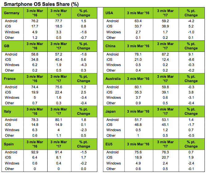 Un grande balzo in avanti iOS lo compie anche in Inghilterra, passando da una quota del 34,8% al 40,4%, registrando un +5,6%. Risulta invece abbastanza stabile negli altri paesi, dove perde, o guadagna, in modo quasi impercettibile.In Giappone iOs fa registrare un meno 1,7%, che non permette alla piattaforma Apple di avvicinarsi ulteriormente a quel sorpasso su Android, che negli stessi tre mesi dello scorso sembrava quasi possibile.