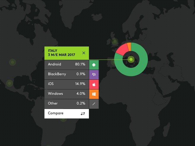 Pochi i cambiamenti anche per Google e Android nel nostro paese, che registra un +1,8% rispetto al dato riscontrato negli stessi tre mesi del 2016; continua a  scendere Windows Phone, che perde 2,3 punti percentuali, e scende ad una quota di mercato del 4%, rispetto al 6,3% dello scorso anno. Si tratta di una vera e propria disfatta per il sistema mobile di Microsoft, che negli anni passati ha invece goduto di supporto dall’utenza italiana. Se si guarda all’eurozona, Windows Phone e l’unico sistema dei tre principali a registrare una perdita di 2,4 punti percentuali, mentre iOS è quello che fa registrare l’incremento più consistente, con una quota del 20,7%, in rialzo dell’1.9%.