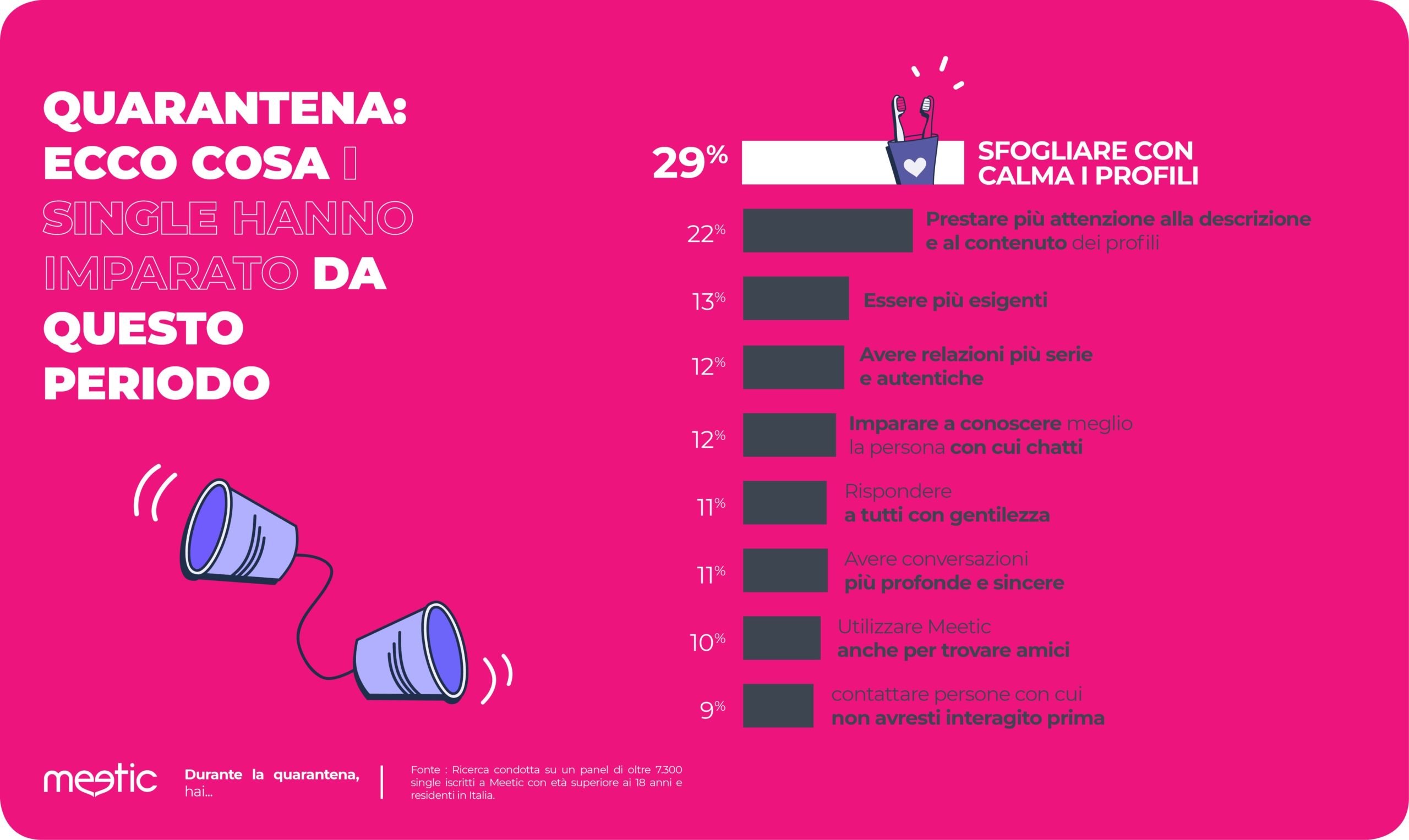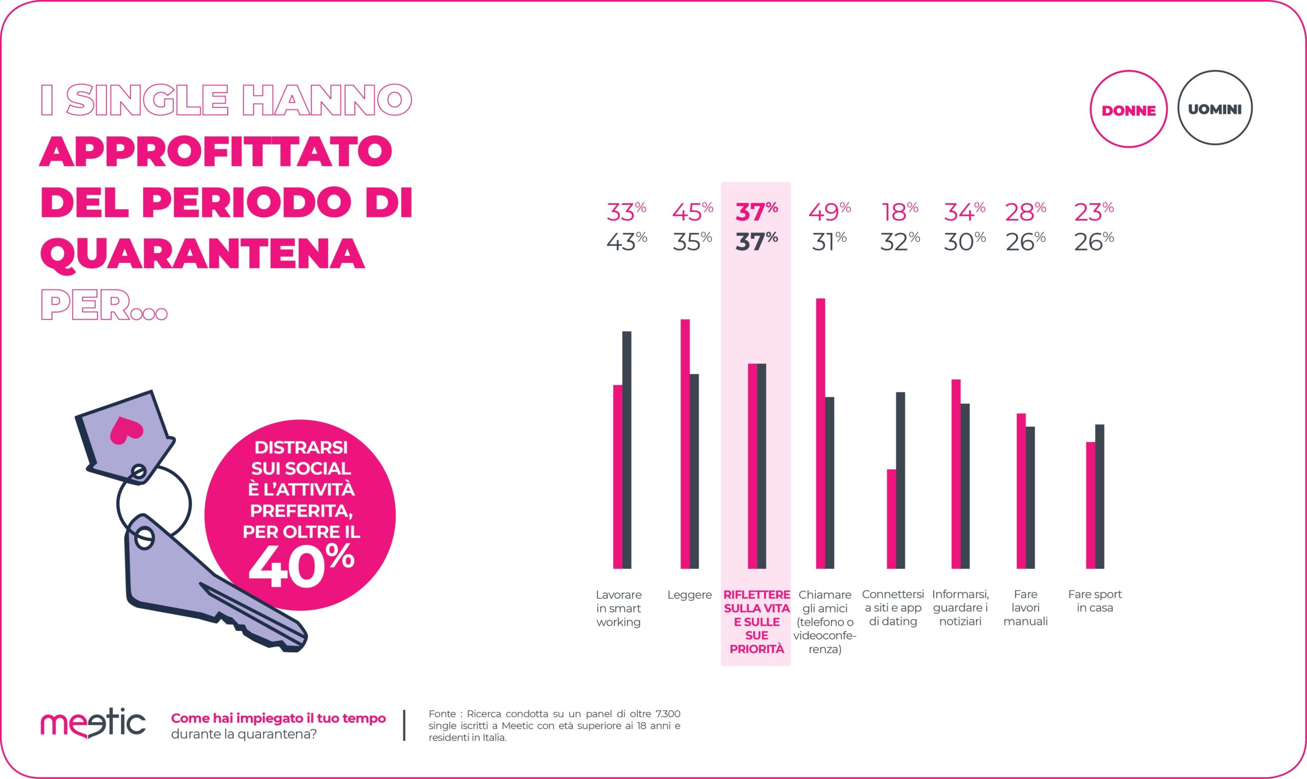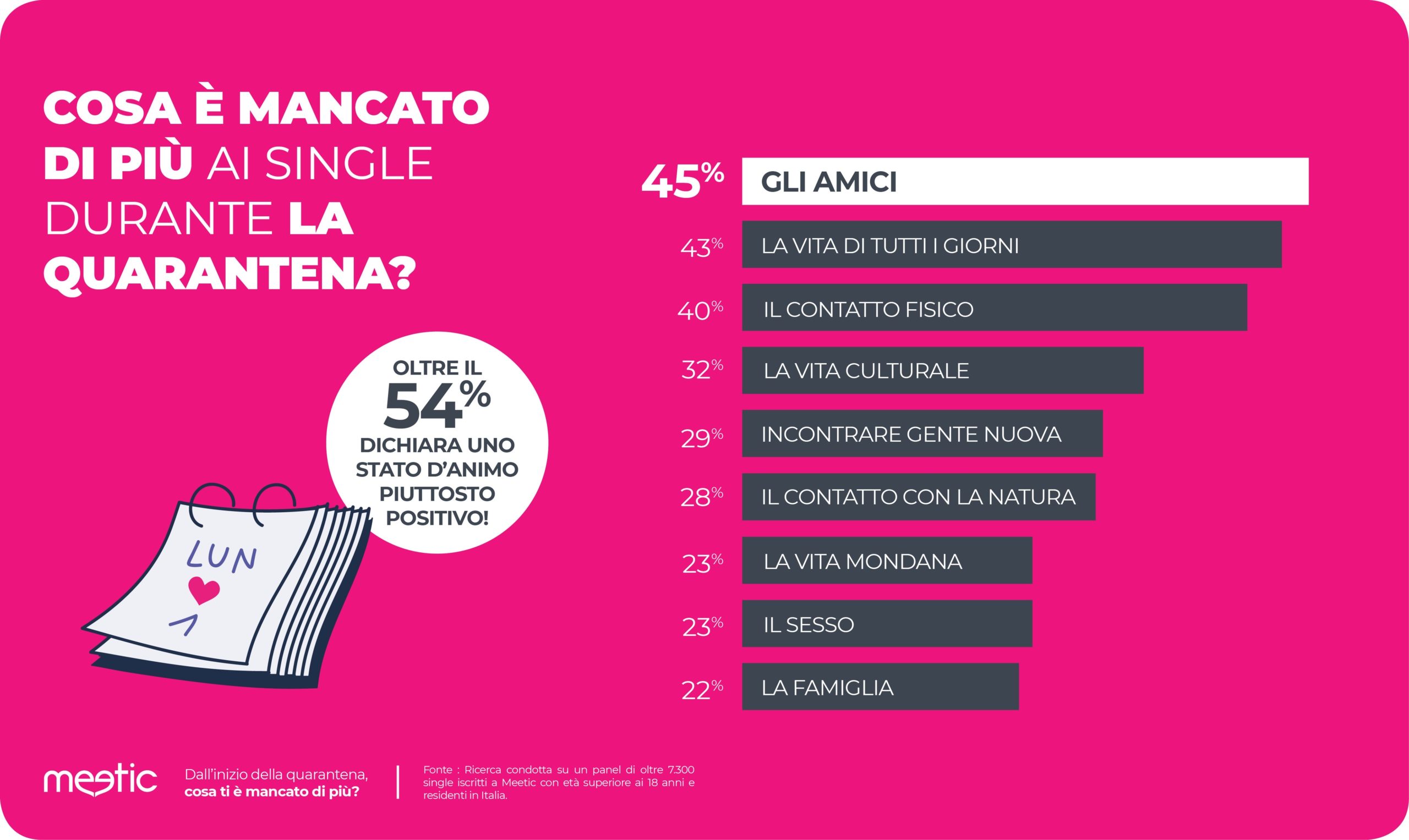Come hanno vissuto la quarantena i single italiani? Sono almeno 20 milioni e Meetic, servizio di dating che vanta di aver contribuito alla nascita – solo in Italia – di “oltre 1 milione di coppie”, lo ha domandato direttamente a 7.300 single della sua community italiana.