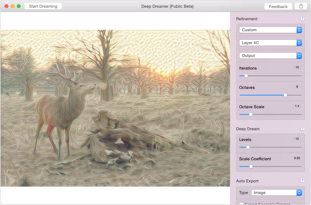 Sfruttando questo motore di elaborazione, il software Deep Dream per Mac è in grado di modificare le fotografie, evidenziando e sottolineando un’interpretazione che prescinde dalla semplice elaborazione visiva ma sia anche in grado di mostrare le relazioni tipiche percepite da una rete neurale.
