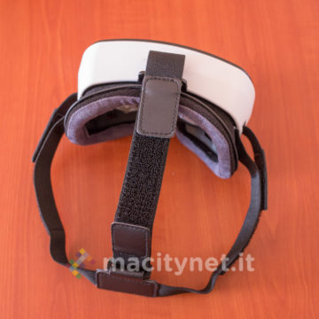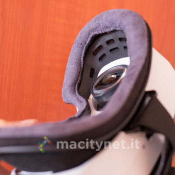 Il punto di forza, come già spiegato, è innanzitutto nella leggerezza. Fasce comprese, il visore pesa appena 280 grammi, decisamente meno dei 390–400 grammi più comuni ad altri visori presenti sul mercato. Per riuscire in questa conveniente impresa il produttore non ha soltanto eliminato il vassoio frontale dedicato allo smartphone ma ha alleggerito anche il resto delle parti che compongono la mascherina frontale combinando uno scheletro in morbida gomma ad inserti in gomma piuma, materiale che troviamo in forma grezza ai lati per garantire una maggiore traspirazione della pelle attraverso appositi fori, e rivestito in soffice tessuto nella cornice più interna, quella in contatto diretto con il volto dell’utilizzatore. Parte di questo rinforzo lo troviamo anche al di sopra dell’apertura dedicata al naso, mossa se non altro azzeccata ma non sufficiente (quantomeno per il nostro ossuto naso) ad ammortizzare il peso del visore durante l’uso prolungato che in effetti, anche se di molto alleggerito, è completamente concentrato in quest’area del viso.
