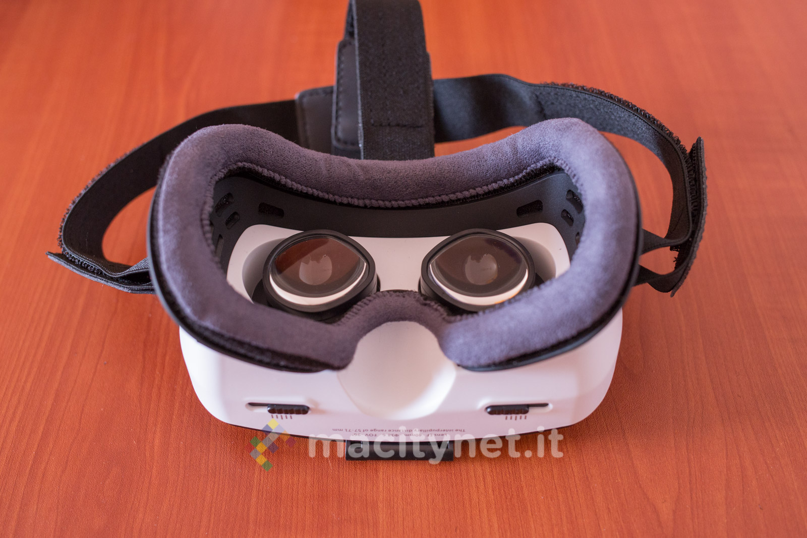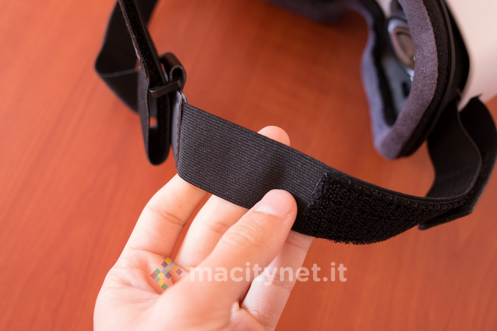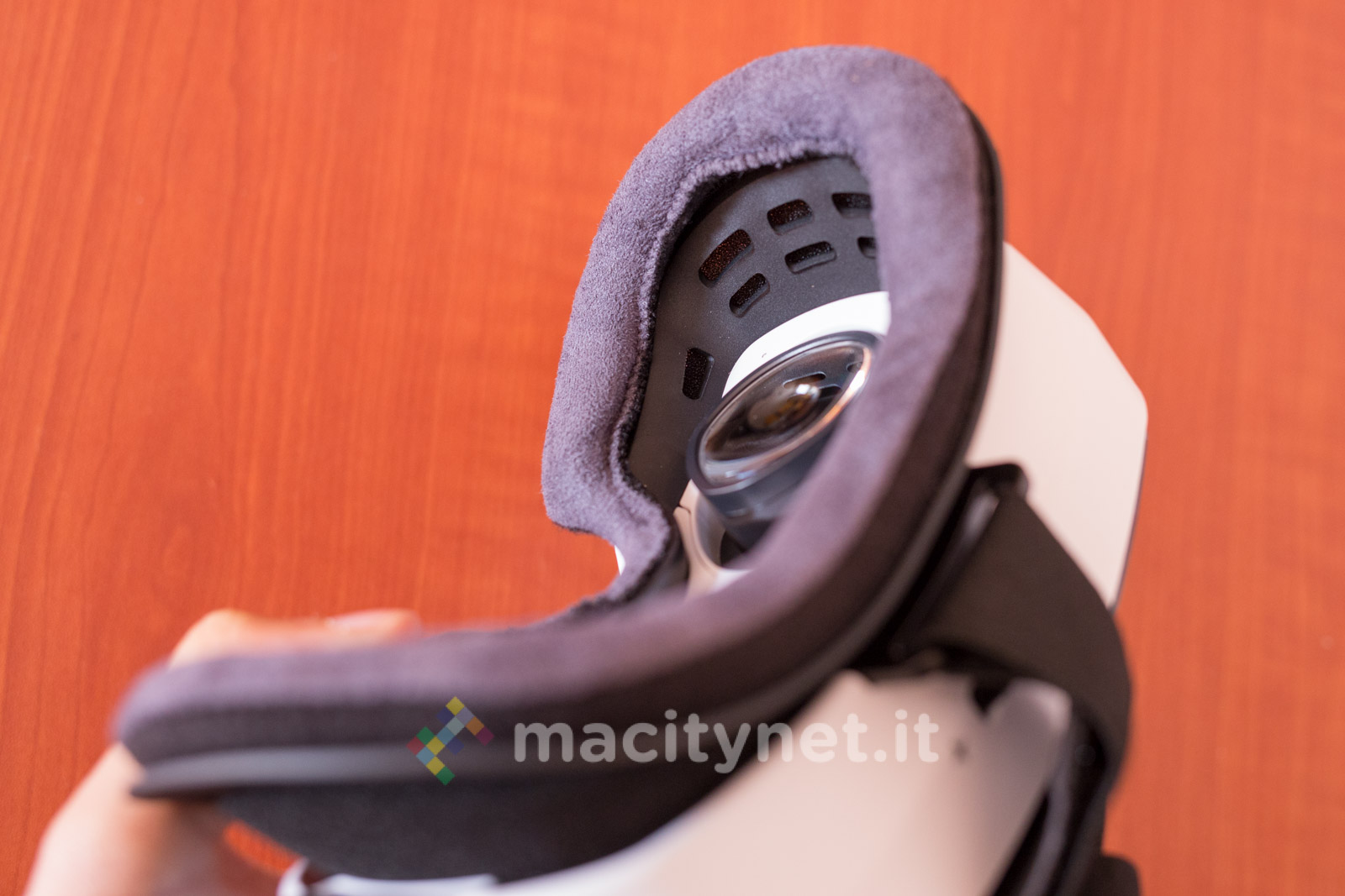Il punto di forza, come già spiegato, è innanzitutto nella leggerezza. Fasce comprese, il visore pesa appena 280 grammi, decisamente meno dei 390–400 grammi più comuni ad altri visori presenti sul mercato. Per riuscire in questa conveniente impresa il produttore non ha soltanto eliminato il vassoio frontale dedicato allo smartphone ma ha alleggerito anche il resto delle parti che compongono la mascherina frontale combinando uno scheletro in morbida gomma ad inserti in gomma piuma, materiale che troviamo in forma grezza ai lati per garantire una maggiore traspirazione della pelle attraverso appositi fori, e rivestito in soffice tessuto nella cornice più interna, quella in contatto diretto con il volto dell’utilizzatore. Parte di questo rinforzo lo troviamo anche al di sopra dell’apertura dedicata al naso, mossa se non altro azzeccata ma non sufficiente (quantomeno per il nostro ossuto naso) ad ammortizzare il peso del visore durante l’uso prolungato che in effetti, anche se di molto alleggerito, è completamente concentrato in quest’area del viso.