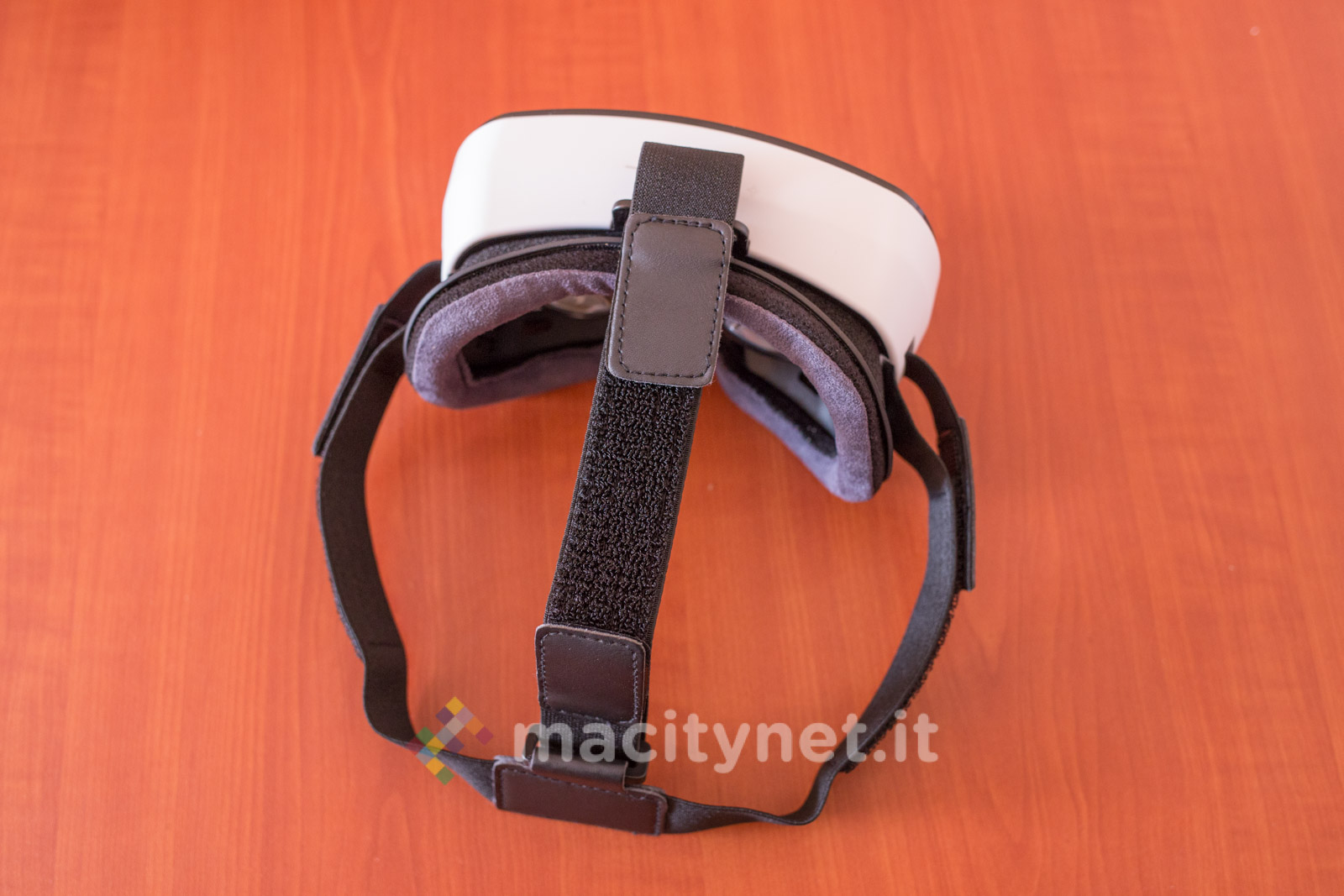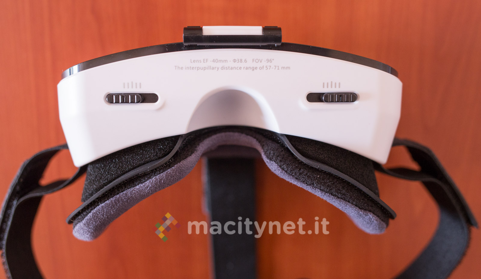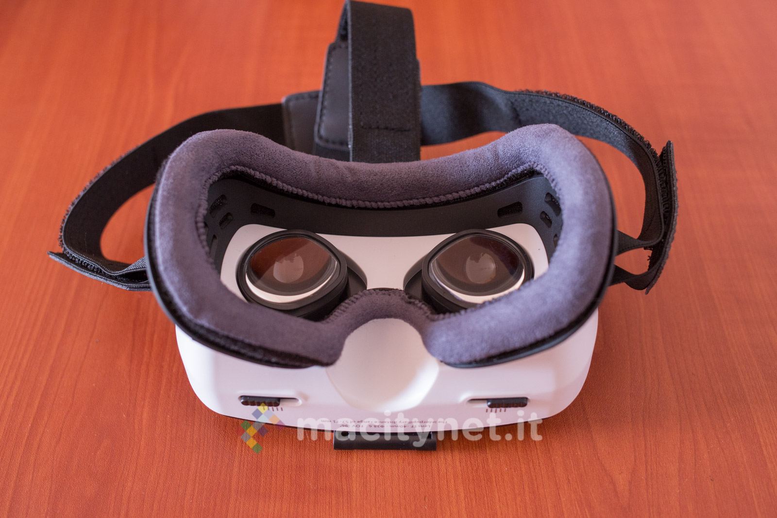Il punto di forza, come già spiegato, è innanzitutto nella leggerezza. Fasce comprese, il visore pesa appena 280 grammi, decisamente meno dei 390–400 grammi più comuni ad altri visori presenti sul mercato. Per riuscire in questa conveniente impresa il produttore non ha soltanto eliminato il vassoio frontale dedicato allo smartphone ma ha alleggerito anche il resto delle parti che compongono la mascherina frontale combinando uno scheletro in morbida gomma ad inserti in gomma piuma, materiale che troviamo in forma grezza ai lati per garantire una maggiore traspirazione della pelle attraverso appositi fori, e rivestito in soffice tessuto nella cornice più interna, quella in contatto diretto con il volto dell’utilizzatore. Parte di questo rinforzo lo troviamo anche al di sopra dell’apertura dedicata al naso, mossa se non altro azzeccata ma non sufficiente (quantomeno per il nostro ossuto naso) ad ammortizzare il peso del visore durante l’uso prolungato che in effetti, anche se di molto alleggerito, è completamente concentrato in quest’area del viso.