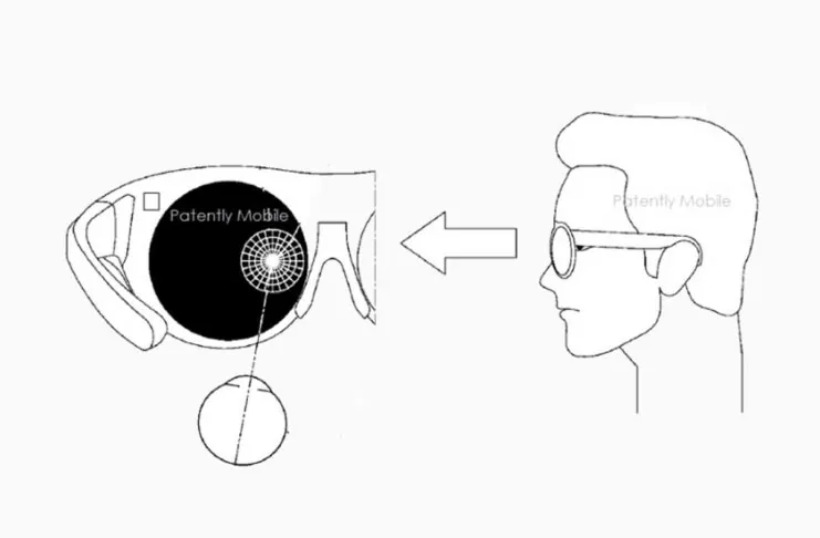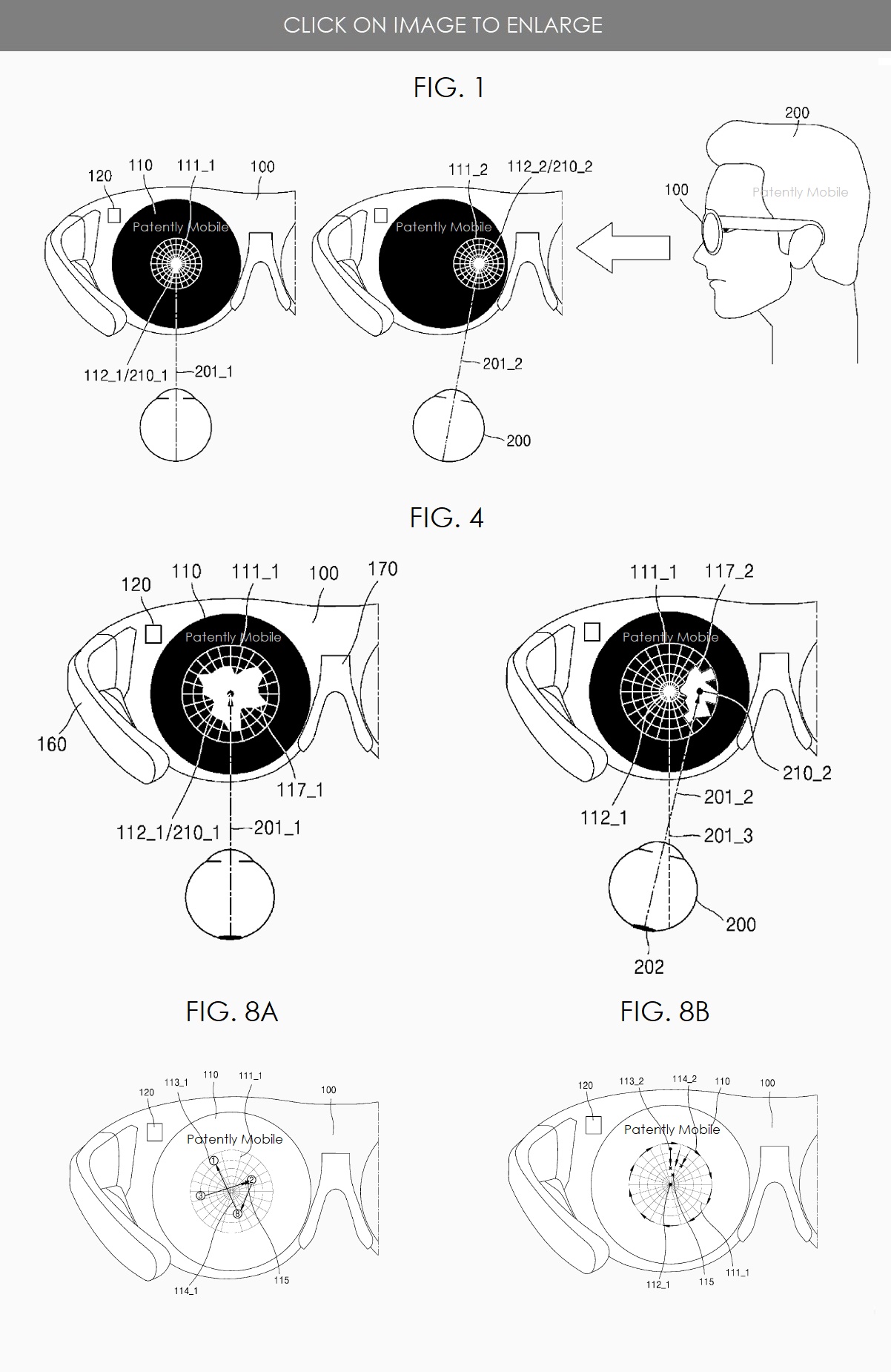 Nel brevetto di Samsung (qui i dettagli scovati dal sito PatentlyApple) sono mostrati degli occhiali smart che integrano un display e un sensore per il tracciamento dello sguardo usato per acquisire informazioni sulla direzione dello sguardo dell’utente rivolto verso il display.