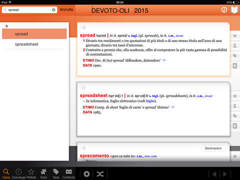 Una volta visualizzata la pagina relativa al termine cercato, è possibile selezionare la sezione“declinazione”, “definizione” oppure la “sin. contr” (sinonimi e contrari). È possibile effettuare ricerche multiple e salvare i “preferiti” per futuri riferimenti. Per consultare il Devoto-Oli non è necessario un collegamento Internet: tutti i termini e le voci sono memorizzati sul dispositivo mentre la connessione alla rete è richiesta solo per ascoltare la pronuncia delle parole. L’app è compatibile con qualsiasi con iPhone, iPod touch e iPad. Richiede iOS 6.1 o successive,
