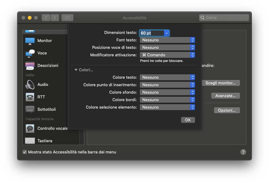 Sempre dalla sezione “Zoom” nella sezione “Accessibilità” delle Preferenze di Sistema è possibile selezionare la voce Ingrandisci testo al passaggio del cursore”. Questa opzione è comoda per chi ha difficoltà a leggere testi piccoli. Tenendo premuto il tasto CMD è possibile visualizzare al volo il testo ingrandito sotto il cursore. La funzione permette di leggere più facilmente le parole sullo schermo del Mac. Basta spostare il cursore sul testo e premere il tasto CMD: si aprirà una finestra con le parole scritte in grande e ad alta risoluzione. E puoi anche scegliere il font e il colore. Dalla sezione Opzioni in Accessibilità è possibile specificare anche dimensioni testo, font da usare, il colore del testo e altre opzioni ancora.