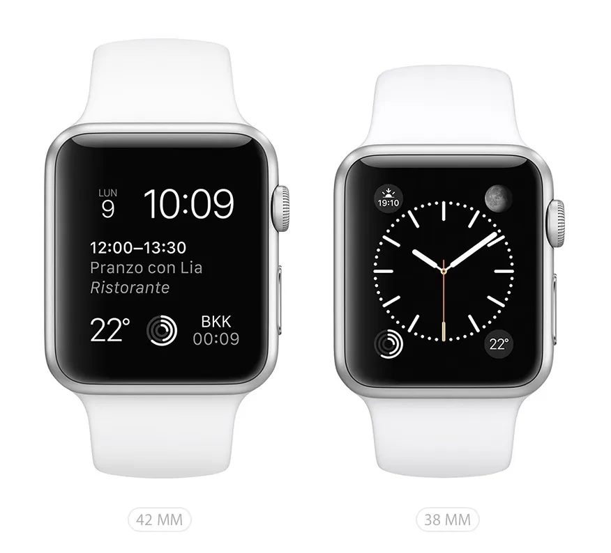 Indipendentemente dal colore della cassa o dal fatto che si tratti di un Apple Watch della collezione Sport, Watch o Edition, il nuovo smartwatch di Apple è disponibile in due diverse dimensioni, con cassa da 38 mm e con cassa più grande da 42 mm.