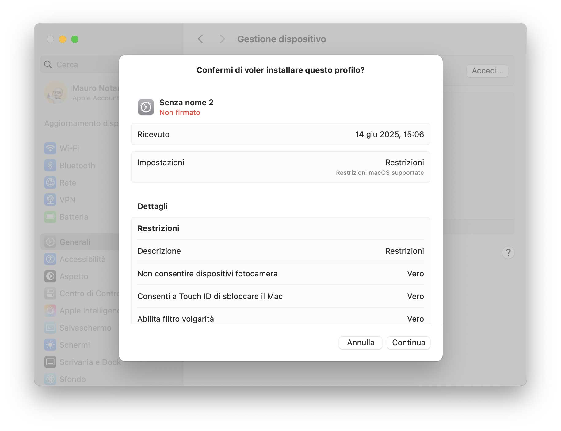 A questo punto è possibile installare il profilo sul Mac dove vogliamo impedire l’uso della videocamera . Di seguito come procedere sui Mac con macOS Sequoia e seguenti: