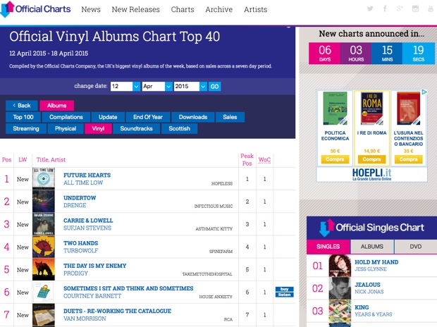 In Regno Unito le vendite dei dischi in vinile continuano ad aumentare, tanto che Official Charts Company ha annunciato che d’ora in poi pubblicherà le classifiche settimanali degli album e anche dei singoli più venduti nel mercato di Sua Maestà. Nel 2014 sempre in UK sono stati venduti 1,29 milioni di dischi LP in vinile, il totale più elevato da 20 anni a questa parte, un record raggiunto dopo 7 anni di crescita continua.