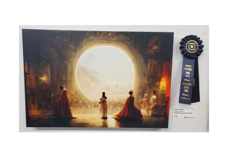 L’uomo in questione si chiama Jason Allen, ed è il presidente di Incarnate Games, azienda che crea giochi da tavolo. Il titolo del lavoro che ha permesso di ottenere il primo premio è “Théâtre D’opéra Spatial”. L’immagine in questione – che Allegan ha stampato su tela come richiesto dal concorso – raffigura una “space opera” e mostra figure in una ambientazione stile Barocco viste da una sorta di finestra circolare assorte in un assolato e scintillante palcoscenico.