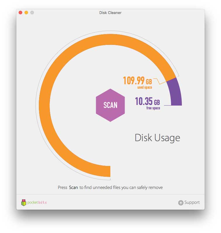 All’avvio viene richiesto di confermare la radice del disco, analizzato velocemente il tutto mostrando graficamente lo spazio occupato (in arancione) e lo spazio libero (in viola). Facendo click su “Scan” vengono analizzati in dettaglio file e documenti vari che occupano spazio prezioso: elementi nel cestino, download, file di cache e cookie dei browser, download di Mail (allegati ai vari messaggi), log delle applicazioni, cache delle applicazioni, download di iTunes. È possibile deselezionare gli elementi che non si desiderano cancellare o fare click su “Clean” per procedere con la pulizia.