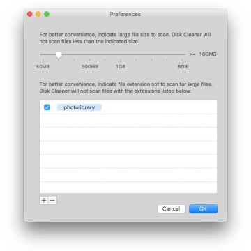Facendo click sull’icona della lente di ingrandimento nella riga “Large file” è possibile individuare i file che “pesano” più di 100MB (dalle Preferenze del programma è possibile cambiare questa impostazione indicando “tagli” più grandi, più piccoli o estensioni da ignorare). Le selezioni del cestino e della cartella “download” richiedono ulteriore conferma prima della cancellazione.