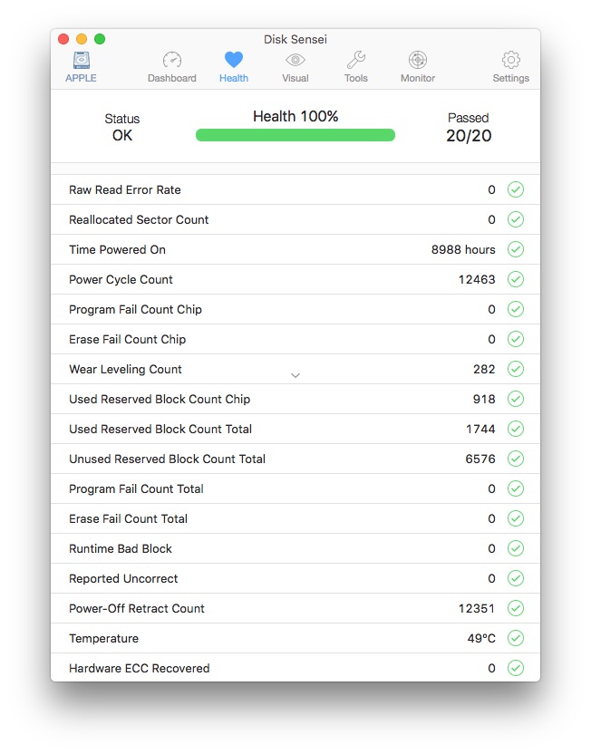 Seconda schermata dopo la “Dashboard”, è lo stato di salute “Health” del drive. Qui vengono eseguiti una serie di test piuttosto veloci: su un vecchio MacBook Air del 2011 con SSD da 250GB ci vogliono meno di cinque secondi. Su dischi connessi esternamente con interfaccia diversa il tempo si può allungare notevolmente.