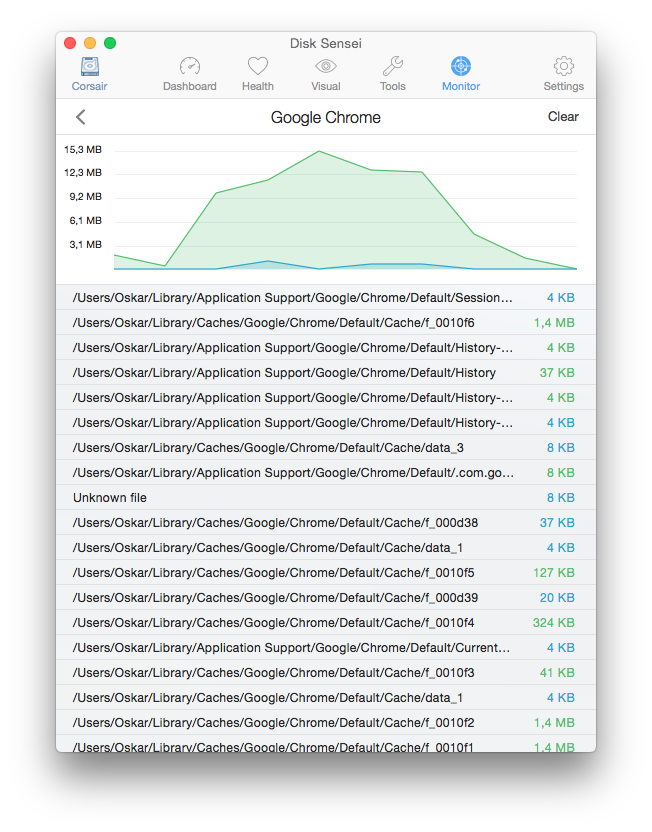 Entriamo nel vivo. Perché Disk Sensei non è solo una app per monitorare ma anche per riparare i dischi. La voce “Tools” allude proprio a questo: È possibile fare pulizia, dalle cache ai documenti di grandi dimensioni o ai download, pratiche queste ultime da seguire con grande cautela e solo se si sa cosa si sta facendo. In ogni caso queste voci non sono selezionate di default e, cliccando sul quantitativo di file/spazio che si libera Disk Sensei offre una lista dettagliata di cosa verrà buttato o purgato. Personalmente sconsiglio i file di grandi dimensioni, perché il sistema fa letteralmente questo: si prepara a buttare via i documenti più grandi contenuti sul computer, che sono spesso video e audio.
