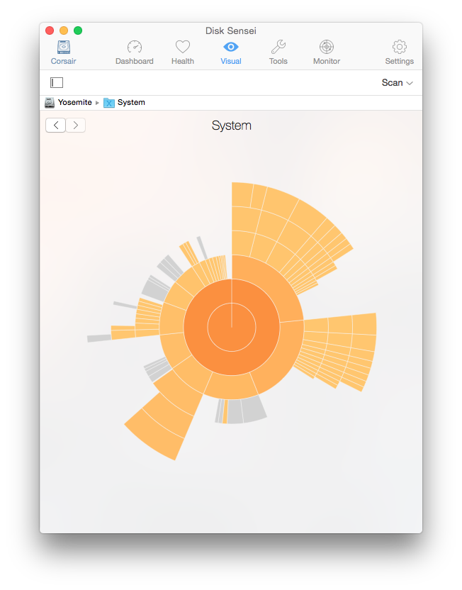 Sorprendente ed utile è la successiva modalità “Visual”, che consente di avere uno sguardo sui contenuti del drive. Utility gratuite, come l’ottima Disk Inventory X, permettono di avere questo tipo di informazione forse con una grana più fine ma è molto utile poter avere rapidamente una vista del filesystem e di cosa lo occupa dallo stesso programma con il quale stiamo facendo test sulla qualità del drive SSD.