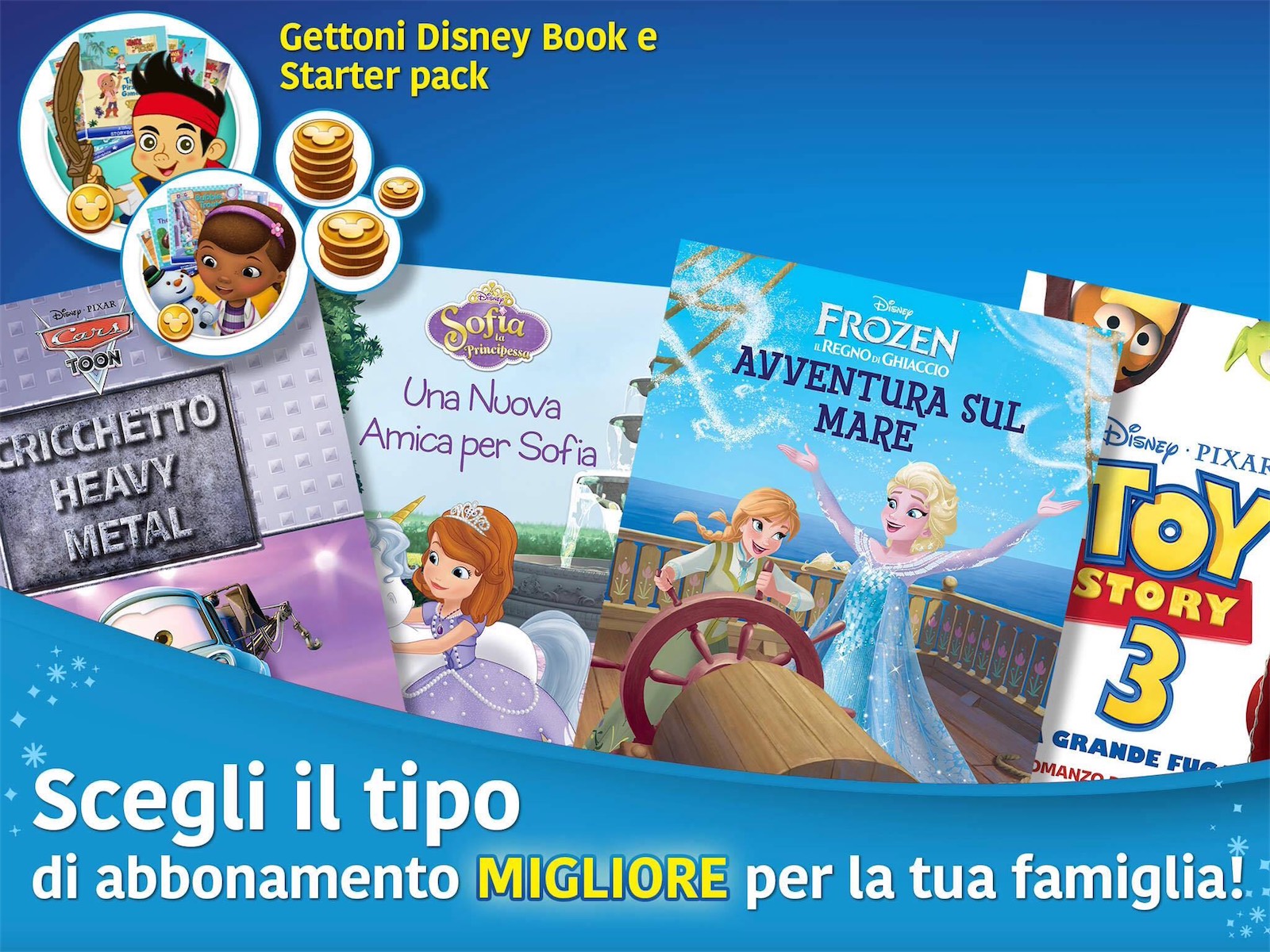 Disney Story Central assegna Gettoni man mano che si procede nella lettura che possono poi essere utilizzati per scaricare nuovi libri Disney. Il catalogo è sterminato ed è composto dalle storie e dai personaggi più famosi Disney, tra cui Frozen, Monsters University, La Casa di Topolino, Rapunzel, Ralph Spaccatutto, Winnie the Pooh, Toy Story e moltissimi altri ancora.