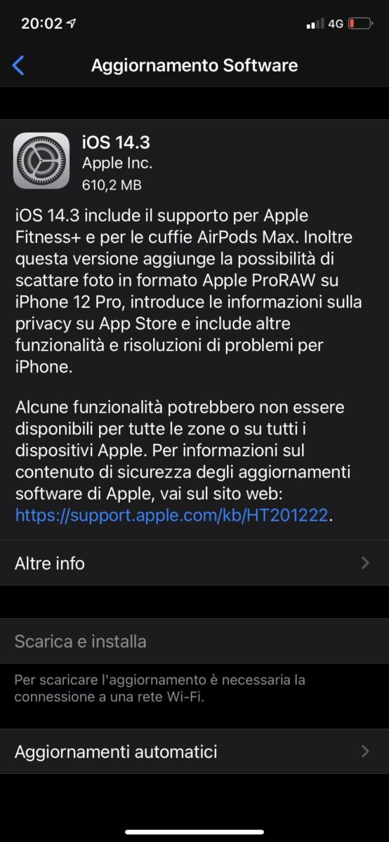 Apple ha rilasciato l’aggiornameno a iOS 14.3 e iPadOS 14.3. Nelle note d rilascio, Apple spiega ch iOS 14.3 include il supporto per Apple Fitness+ e per le cuffie AirPods Max. Inoltre questa versione aggiunge la possibilità di scattare foto in formato Apple ProRAW su iPhone 12 Pro, introduce le informazioni sulla privacy su App Store e include altre funzionalità e risoluzioni di problemi per iPhone.