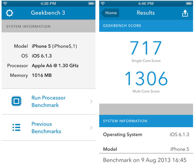 Va notato che il nuovo Geekbench 3 impiega un nuovo sistema base di riferimento per assegnare i punteggi, questo significa che i punteggi ottenuti con il precedente Geekbench 2 non possono essere confrontati con quelli forniti dalla nuova release. Tra le novità ricordiamo anche la nuova interfaccia grafica implementata per Geekbench 3 per iPhone e iPad, con design più semplice che richiama lo stile di iOS 7. Per i dispositivi mobile della Mela il nuovo Geekbench tiene in memoria il punteggio ottenuto di tutti i test effettuati inoltre permette la condivisione tramite Dropbox.