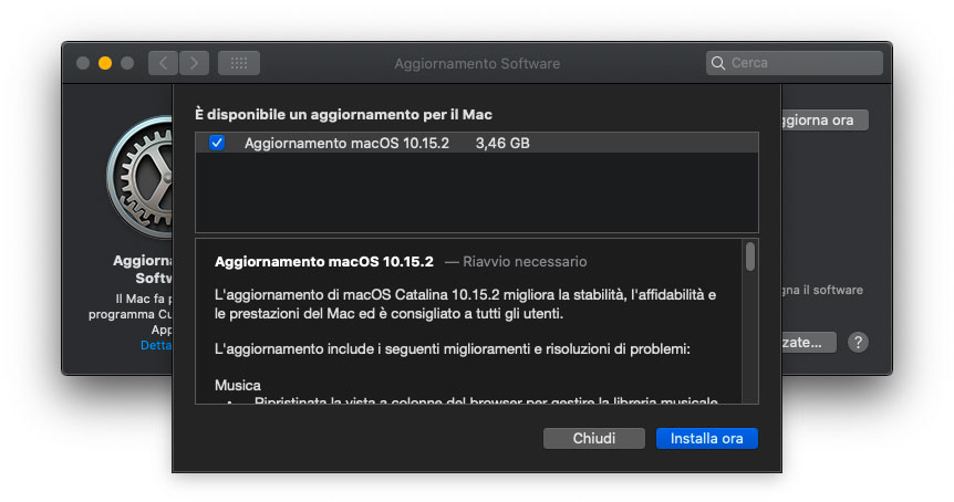 Apple spiega che l’update a macOS 10.15.2 (build 19C57) “migliora la stabilità, l’affidabilità e le prestazioni del Mac ed è consigliato a tutti gli utenti”.