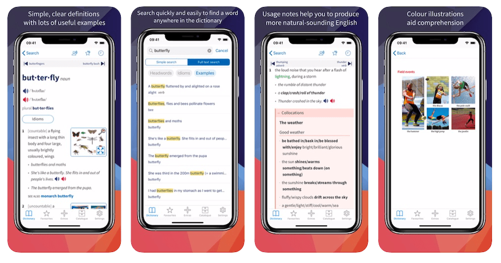 È possibile registrare la propria voce e confrontare la pronuncia con quella di un madrelingua, ascoltare e confrontare frasi di esempio in inglese britannico e americano, aggiungere le parole di proprio interesse tra i “preferiti” e creare cartelle per salvare per tema.
