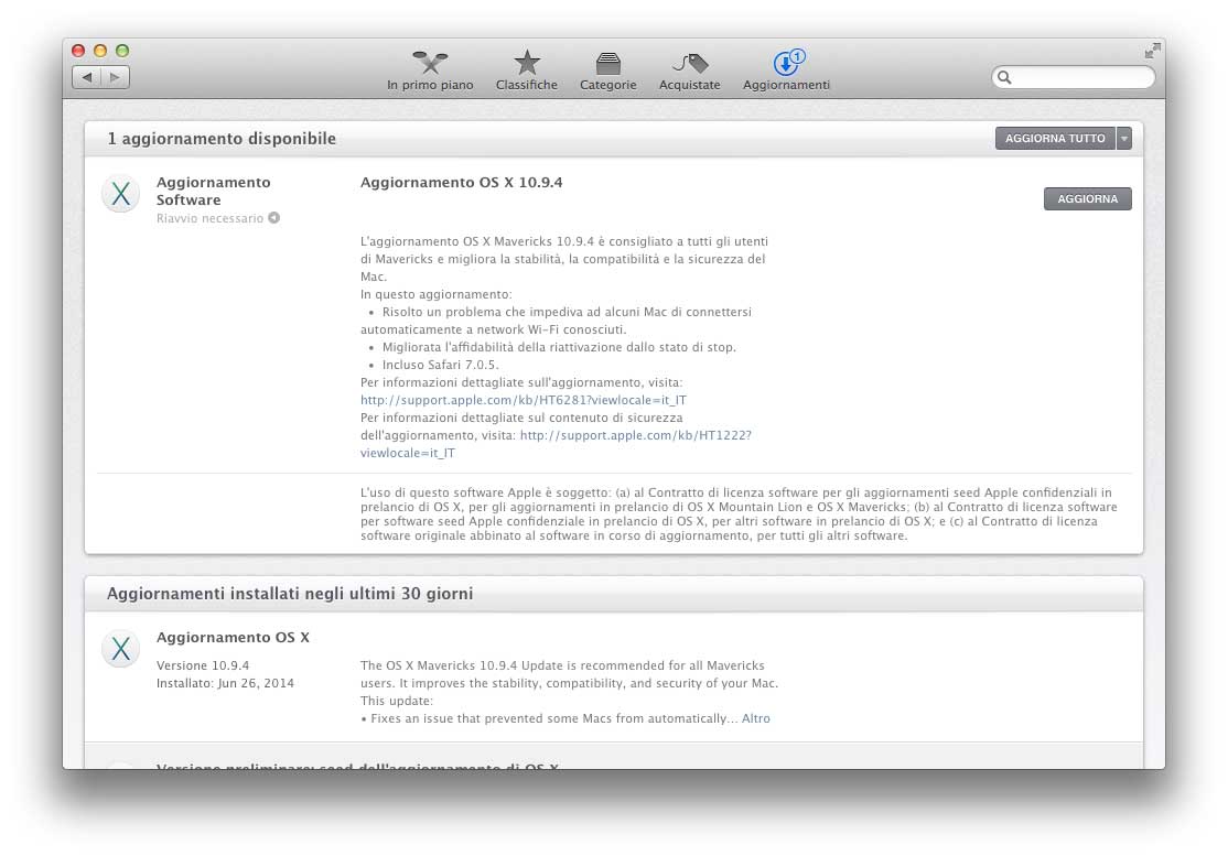 L’update può essere scaricato anche dal web (comodo per chi ha più macchine da aggiornare) nella versione “delta” (per chi ha già OS X 10.9.3) anche da questo indirizzo (sono 283MB) e nella versione “combo” (per chi ha qualsiasi versione 10.9.x, dalla 10.9.0 alla 10.9.3) da quest’altro indirizzo (sono 958.2MB).