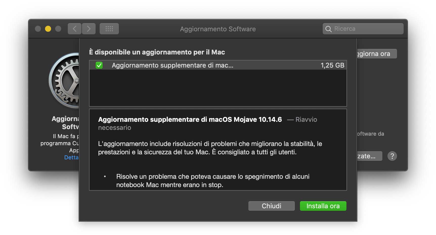 Per ottenere l’aggiornamento di Mojave basta aprire le Preferenze di Sistema, selezionare “Aggiornamento software” e fare click su “Aggiorna ora”.