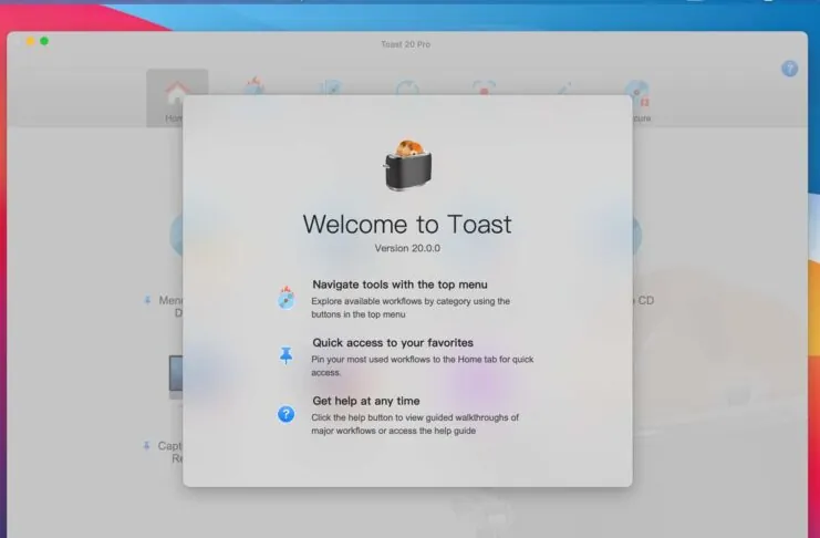 Per padroneggia una varietà di flussi di lavoro di Toast 20 con nuove procedure dettagliate all’interno del prodotto. Con le guide su schermo, impara a realizzare qualsiasi cosa, dalla masterizzazione di video, foto o audio alla creazione di dischi duplicati, alla conversione di file tra formati e altro ancora.