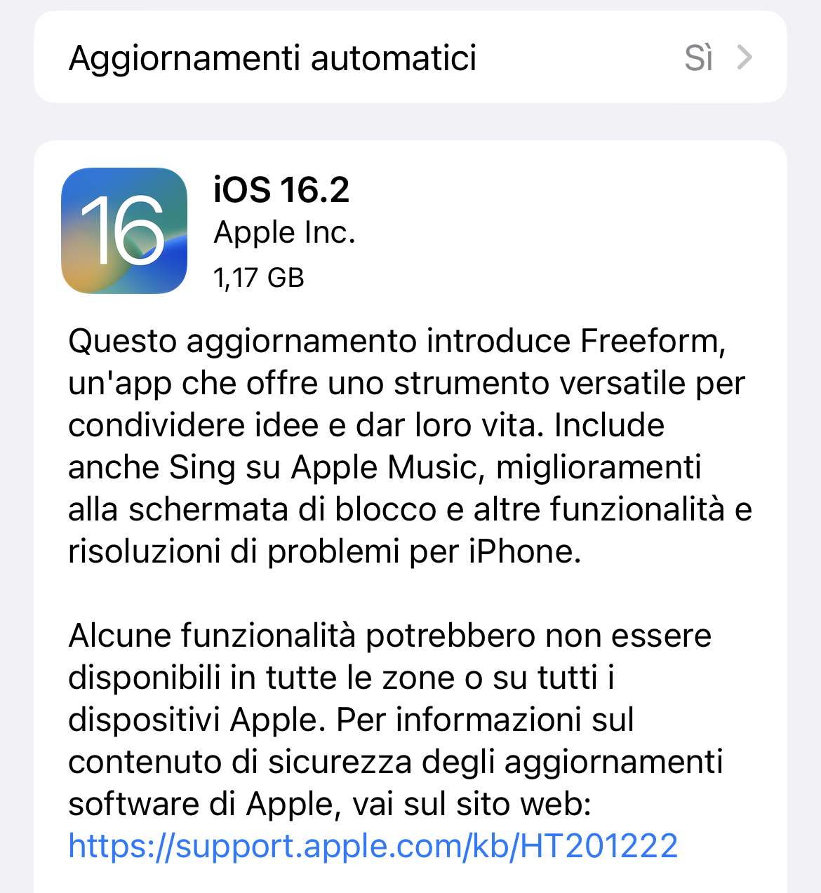 Di seguito le note di rilascio complete dell’upadate a iOS 16.2: