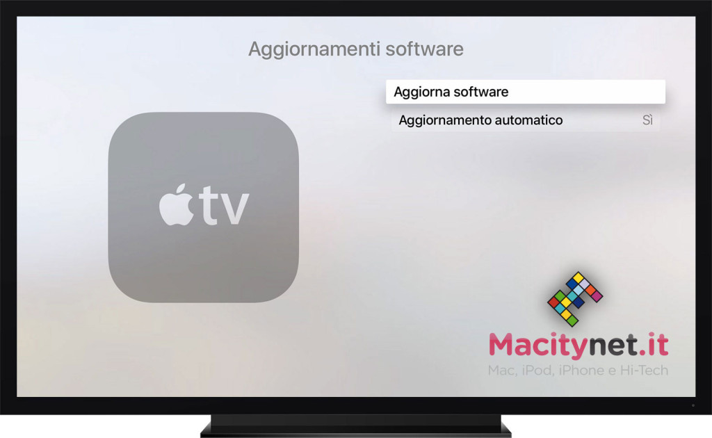 Il software più recente per la Apple TV di 4a generazione può essere scaricato andando in Impostazioni > Sistema > Aggiornamenti software e selezionando “Aggiorna software”. Apple ricorda che durante l’aggiornamento l’indicatore di stato potrebbe lampeggiare lentamente: è fondamentale non disconnettere o scollegare il dispositivo finché l’aggiornamento non viene completato.