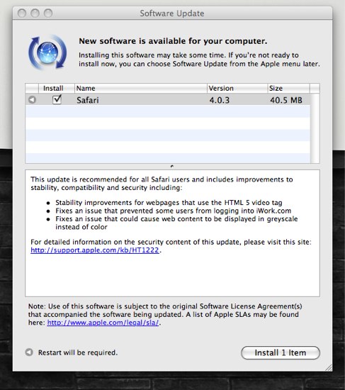 Safari 4.03 è disponibile per Tiger e Leopard tramite l’aggiornamento software automatico di Mac Os X, oppure dall’apposita pagina di Safari.