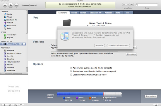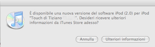 Per poter aggiornare il firmware di iPod touch occorre la nuova versione di iTunes 7.7. Al momento non è disponibile un collegamento a una pagina Web da cui effettuare il download. L’operazione si avvia automaticamente tramite iTunes, una volta collegato l’iPod touch al Mac.
