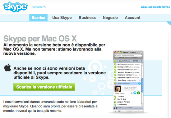 Nel momento in cui scriviamo Skype 4.0 Beta 1 è disponibile solamente per la piattaforma Windows e può essere scaricato a partire da questo indirizzo. Un messaggio pubblicato in questa pagina avvisa che la versione per Mac OS è in lavorazione.