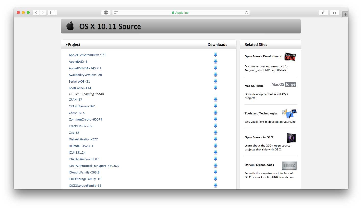 Il sistema operativo dei Mac integra diverse componenti open source. Come già fatto in precedenza per i precedenti sistemi, Apple ha rilasciato le versioni aggiornate dei componenti open source di OS X 10.11 El Capitan.