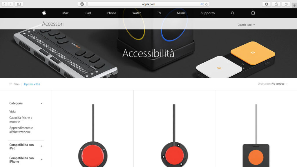 Nel negozio Apple Store online sono ora in vendita dispositivi per l’ Accessibilità compatibili con iPad, iPhone e Mac. È possibile selezionare la categoria di proprio interesse (vista, capacità fisiche e motorie, apprendimento e alfabetizzazione) e visualizzare l’elenco di diverse periferiche e dispositivi che permettono di usare computer e dispositivi mobile della Mela anche da parte di persone diversamente abili.