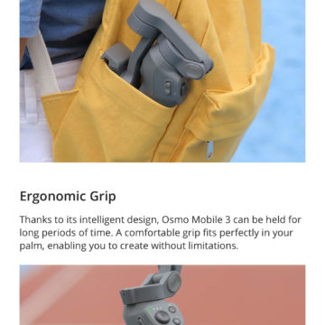 Osmo Mobile 3 è una versione più economica del precedente modello, con la caratteristica di essere pieghevole. Lo stabilizzatore elettronico, naturalmente a 3 assi, ha un nuovo design e un meccanismo di bloccaggio che occupa molto meno spazio rispetto a Osmo Mobile 2. Allo stesso tempo, è più facile da usare grazie al nuovo controllo Quick Roll che commuta il gimbal dalla modalità verticale a quella orizzontale senza la necessità di rimuovere il telefono.