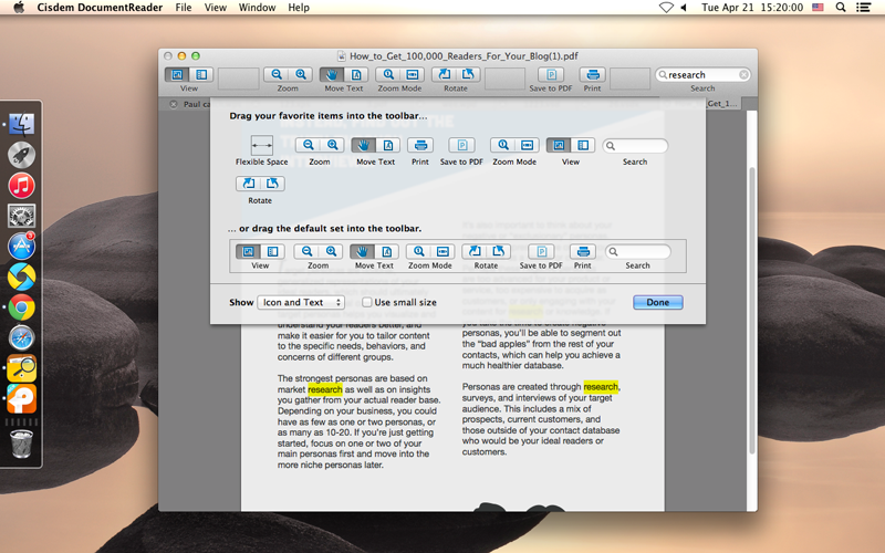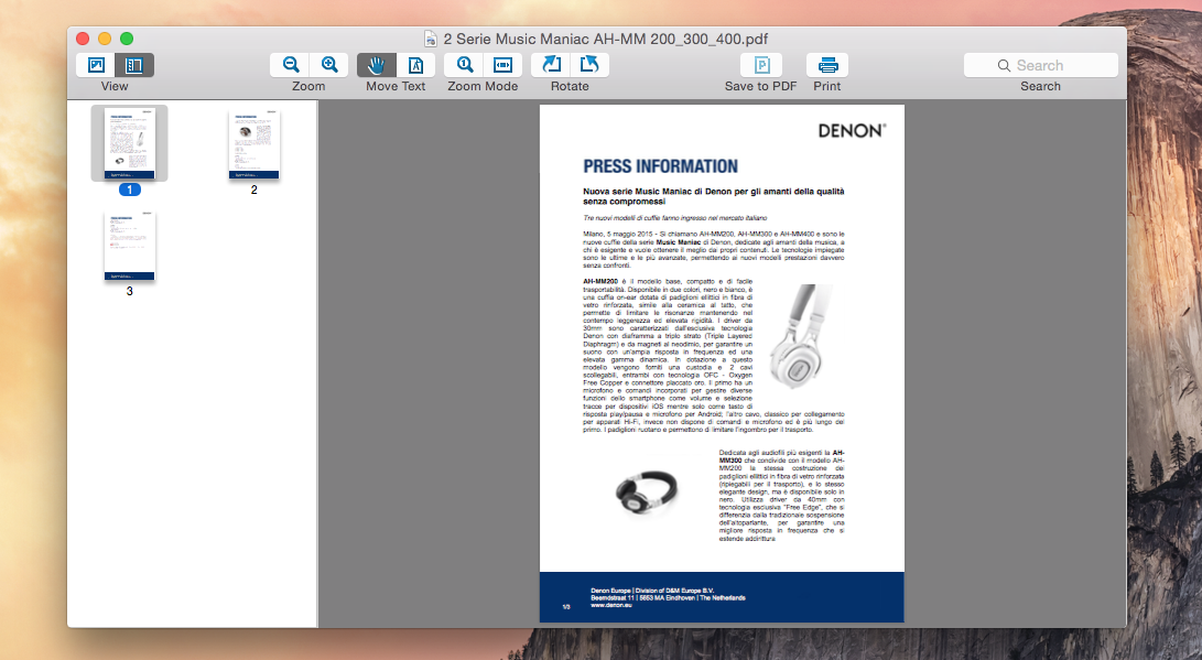 DocumentReader è un applicativo leggero e minimale, sia nell’aspetto grafico, sia nelle funzioni. Questo lo rende particolarmente facile e immediato da utilizzare, oltre a non gravare assolutamente sulle risorse del Mac. Aprendo un file con DocumentReader si avrà immediatamente un’ampia visuale sul documento, mentre barra degli strumenti e altre utility occupano uno spazio ridotto della finestra. Questo consente di avere subito a portata di mano l’intero documento, in modo tale da focalizzare l’attenzione sui contenuti. Una barra a sinistra, invece, risulta particolarmente utile per visualizzare le miniature delle pagine: questo sistema permette immediatamente di scorrere da una pagina all’altra cliccando sulle varie anteprime in piccolo, potendo così saltare dalla prima all’ultima pagina, o comunque aprire velocemente pagine diverse anche se non sono in sequenza.